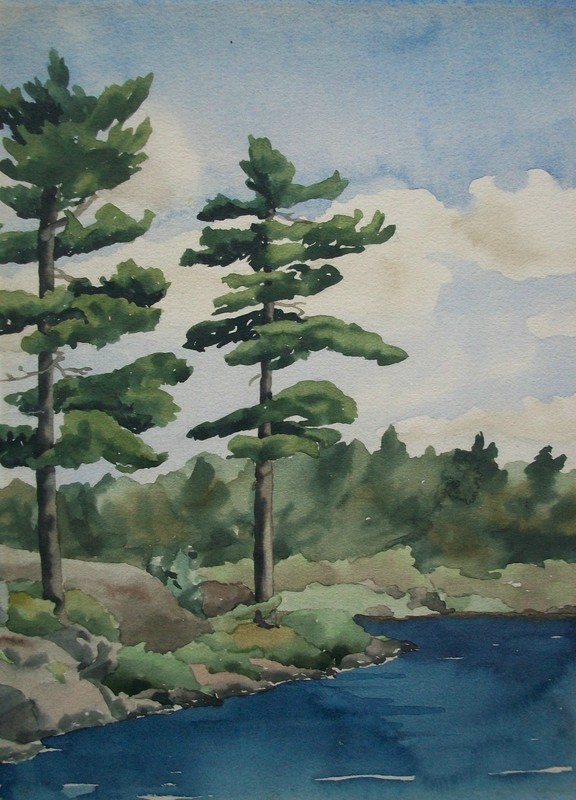 Vintage Canadian Impressionist style watercolor painting of iconic northern pine trees beside a lake set against a blue sky with clouds - unsigned by the artist - from the mid part of the 20th century. The over-all condition of this pre-owned vintage item is excellent - with minor fading (as photographed) - applied to a backboard with adhesive (most likely rubber cement) - ready to frame. Size of painting - 6 3/4"W x 9 1/8"H. Board size - 10 1/4"W x 12 1/2"H.